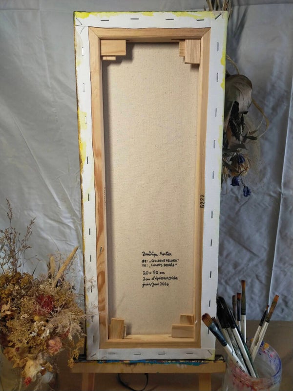 Peinture à l'acrylique sur un format de 20x50cm. L'épaisseur de la toile fait environ 2cm.