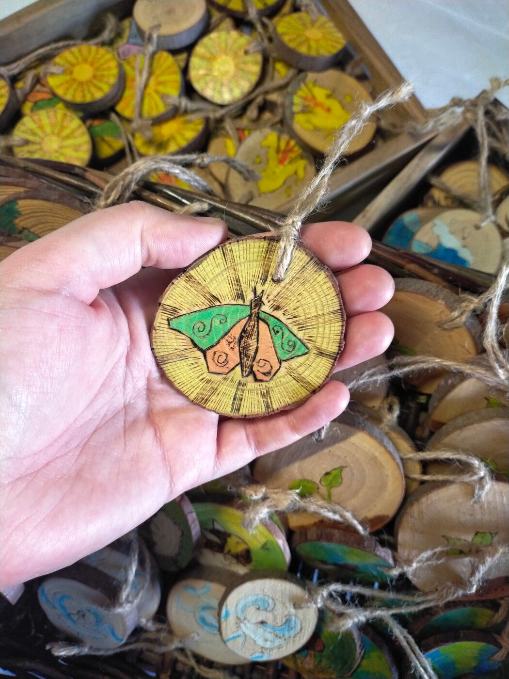 Ces pendentifs en bois sont réalisé à la pyrogravure et colorer avec un mélange de peinture acrylique et d'aquarelle. Toutes faites à la main, même si le motif est le même, chaque pièce est donc unique et peut varier de la photo. Le motif est scellé au vernis. Certains sont encore signé avec mon ancienne signature "by yuki" que j'utilisais avant d'avoir accepté mon vrai nom comme nom d'artiste.
