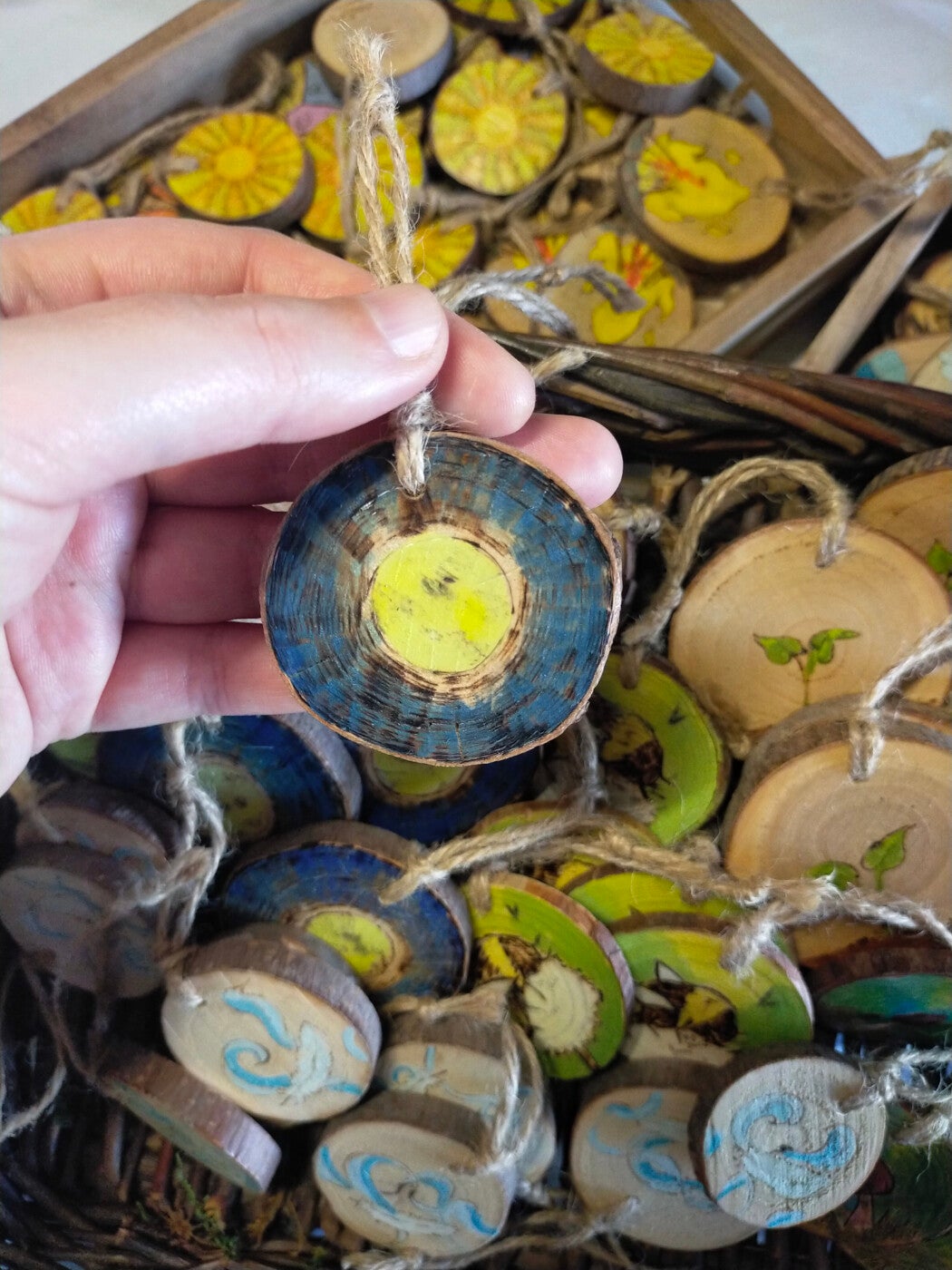 Bei der, für diese Holzanhänger verwendeten, Technik handelt es sich um Brandmalerei. Hierfür nutze ich einen Pyrografiestift zum Brennen in das Holz und koloriere das Motif anschließend mit einer Mischung aus Aquarell- und Acrylfarben. Jedes Stück ist handgefertigt, somit ein Unikat und kann vom Foto etwas abweichen. Das Motif ist mit Firnis versiegelt. Auf vielen ist noch meine alte Signatur "by yuki" heißt bevor ich meinen eigenen Namen als Künstlername genutzt habe.